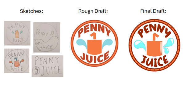 For my logo, I decided to use the penny concept and run with it, creating a fun design with the words penny juice inside of a penny with a juice box symbol. I played around with a few different versions of the penny idea, but I always knew I had to use a penny somehow in the design. With my feedback, I improved the contrast, changed the font to be more playful and fun, and added details and highlights. For colors, I went with a copper orange, a deep brown, and a bright teal, which contrasted nicely against each other. The teal reminded me of both water/juice and how pennies turn green or teal after they oxidize.