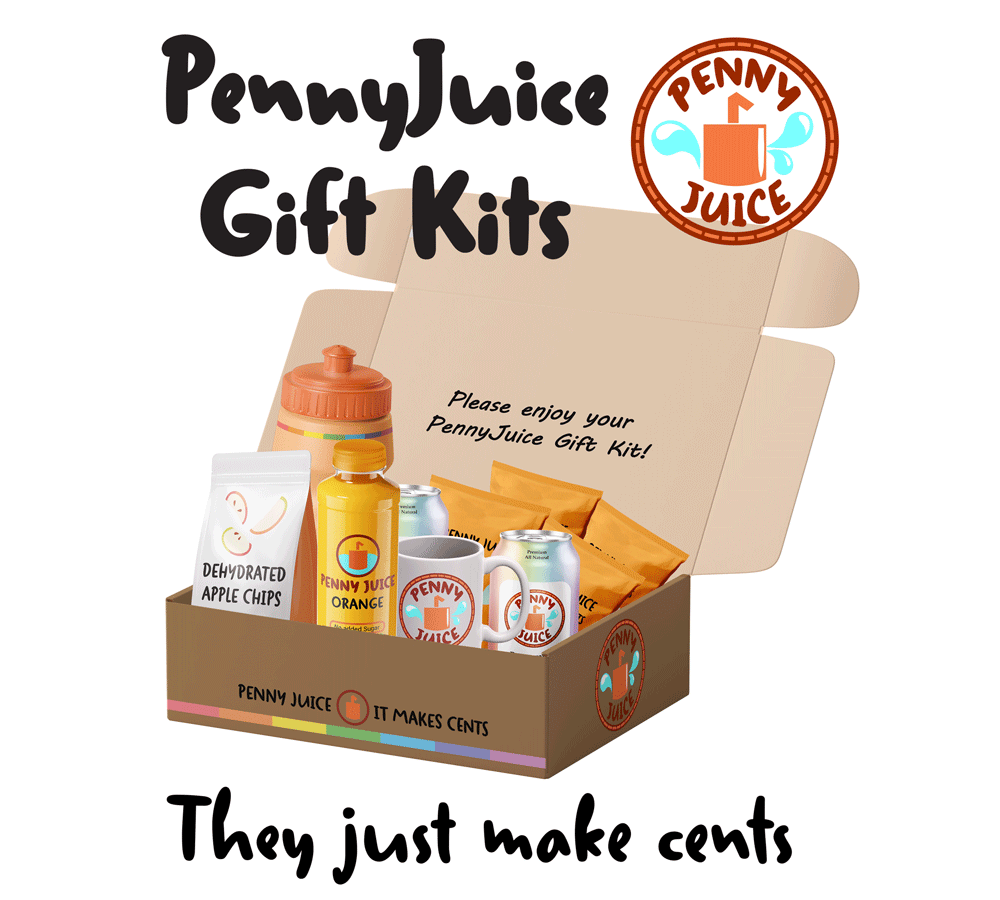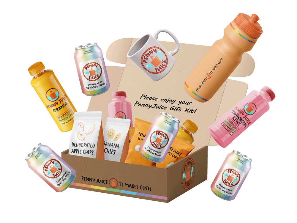 Merchandise: Inside the fan kit and everything kit, there would be some PennyJuice brand merch. A reusable water bottle with the tagline It Makes Cents, a mug with the logo, and a Penny Juice branded hoodie.